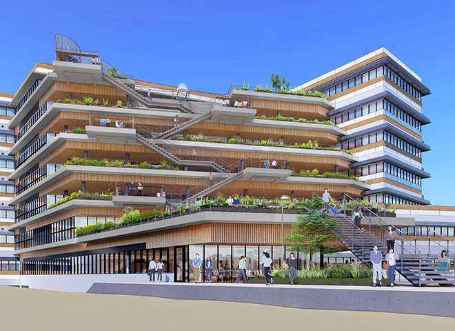 2026年4月に新設するデジタルメディア学部、工学部ロボティクス学科、健康科学部臨床工学科の学びを支える新棟を建設中です。地上8階建てで工学・医療系の最先端機器を導入し、各フロアには緑化テラスにつながるコモンズや地域の方もご利用いただけるカフェテリアを新設します。