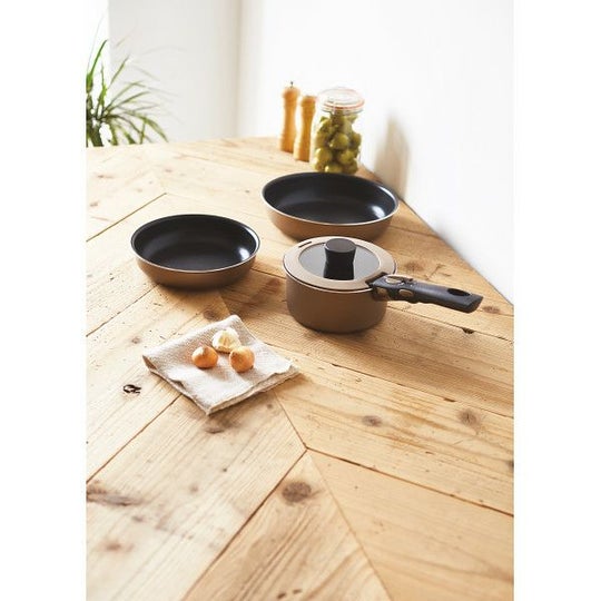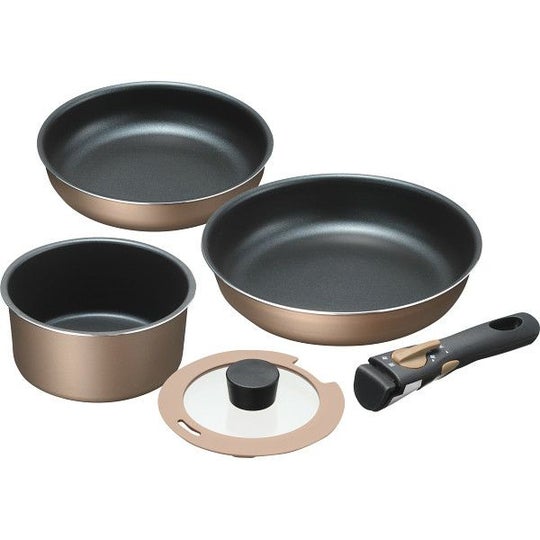 本体=アルミニウム(内面フッ素樹脂加工・ダイヤモンドコート)、底部=ステンレス、蓋=強化ガラス(シリコーンゴム)、ハンドル・ツマミ=フェノール樹脂鍋16cm=容量約1.5l(深さ約7.9cm)、フライパン20cm=深さ約4.5cm、フライパン24cm=深さ約5.2cm、ガラス蓋16cm、着脱ハンドル×各1ガスコンロ可、100・200V電磁調理器対応